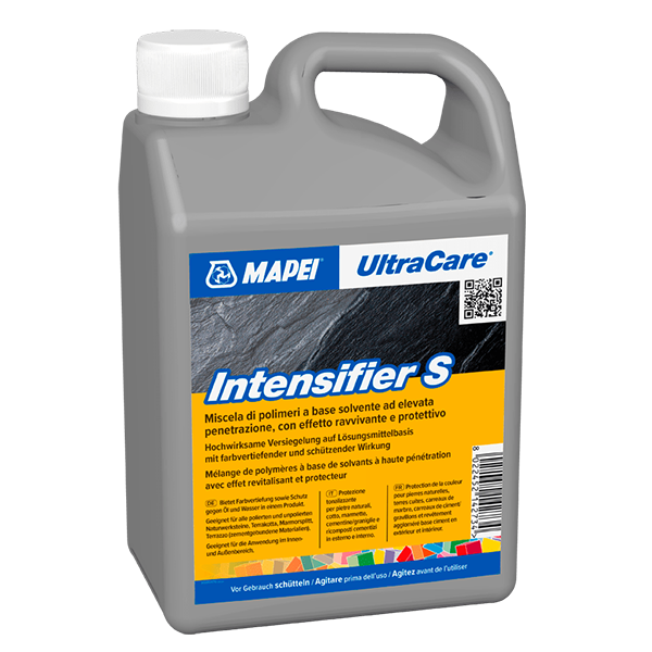 Innovatív, oldószer alapú készítmény, mely a természetes kő, terrakotta, terrazzo, márvány agglomerát, cementlap és műkő burkolatok védelmére és színének kiemelésére szolgál bel- és kültéren egyaránt. A termék különleges oldószer alapú formulája könnyen beszívódik a kezelt felületbe, akkor is, ha az különösen tömör vagy polírozott. A termékkel kezelt hordozó felület nedvszívó képességétől és felületi minőségétől függően 1 liter UltraCare Intensifier S akár 50 m²-re is elegendő lehet (egy rétegben).