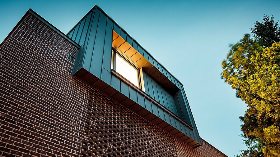 A felső szintet P.10 antracit színű PREFALZ alumíniumburkolat fedi, amely egy masszív, vasbeton szerkezetű, vörösesbarna téglával burkolt alsó épülettömegen helyezkedik el. A vízszintesen rakott téglák izgalmas kontrasztot alkotnak a homlokzaton függőlegesen futó, korcolt alumíniumlemezekkel. A letisztult, geometrikus formavilág megőrzése érdekében az alumínium homlokzat vízelvezetését rejtetten, a fal síkján belül alakították ki.