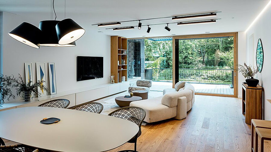 A tetőszinten kapott helyet a szülői hálószoba saját fürdővel, valamint egy külön wellnessrészleg. A kissé eltolva kialakított tetőformának köszönhetően tudatosan létrehozott fedett teraszok, beugrások és védett külső terek jöttek létre. A konyhában, a lépcsőházban és a fürdőszobákban használt márványhatású természetes kőburkolatok és világos tölgyfa felületek visszafogott, elegáns hangulatot adnak a belső tereknek.